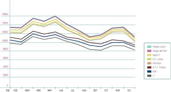 Incluye Bajas I. T., Bajas Maternidad, Bajas Accidente Trabajo, Bajas Permisos, Bajas Acúmulo Lactancia, Agotamiento I.T., Bajas Riesgo del Embarazo, Bajas Riesgo Lactancia.